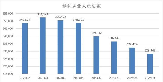 就拿券商来说,这两年从业人员数量显著下降。截至3月30日,证券从业人员数量为32.83万人,跟2023年3季度比起来,减少了2.4万人。