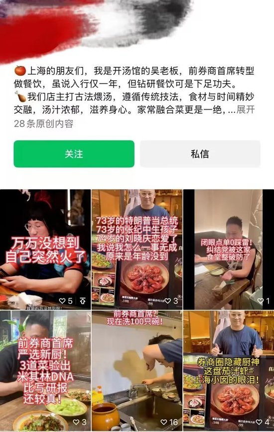 但现在的吴首席脱去西装、系上围裙,变身“开汤馆的吴老板”,一边在后厨、前厅忙个不停,一边打着券商首席的噱头拍视频,比如: