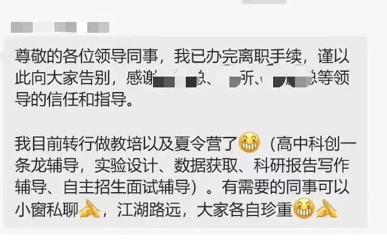 而小周转行干教培,主要干的就是高中科创一条龙辅导,包括实验设计、数据获取、科研报告写作辅导、自主招生面试辅导等,“钱景”可比做卖方强多了。